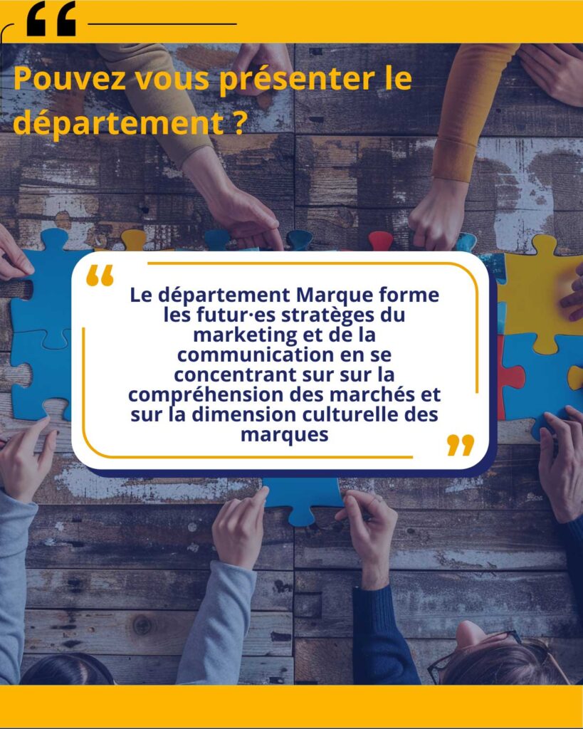 Le département Marque forme les futur·es stratèges du marketing et de la communication, destinés à évoluer principalement en agence ou chez les annonceurs. Nos formations s’appuient sur une approche communicationnelle du marketing, particulièrement attentive à la dimension symbolique et culturelle de la communication et des marques.